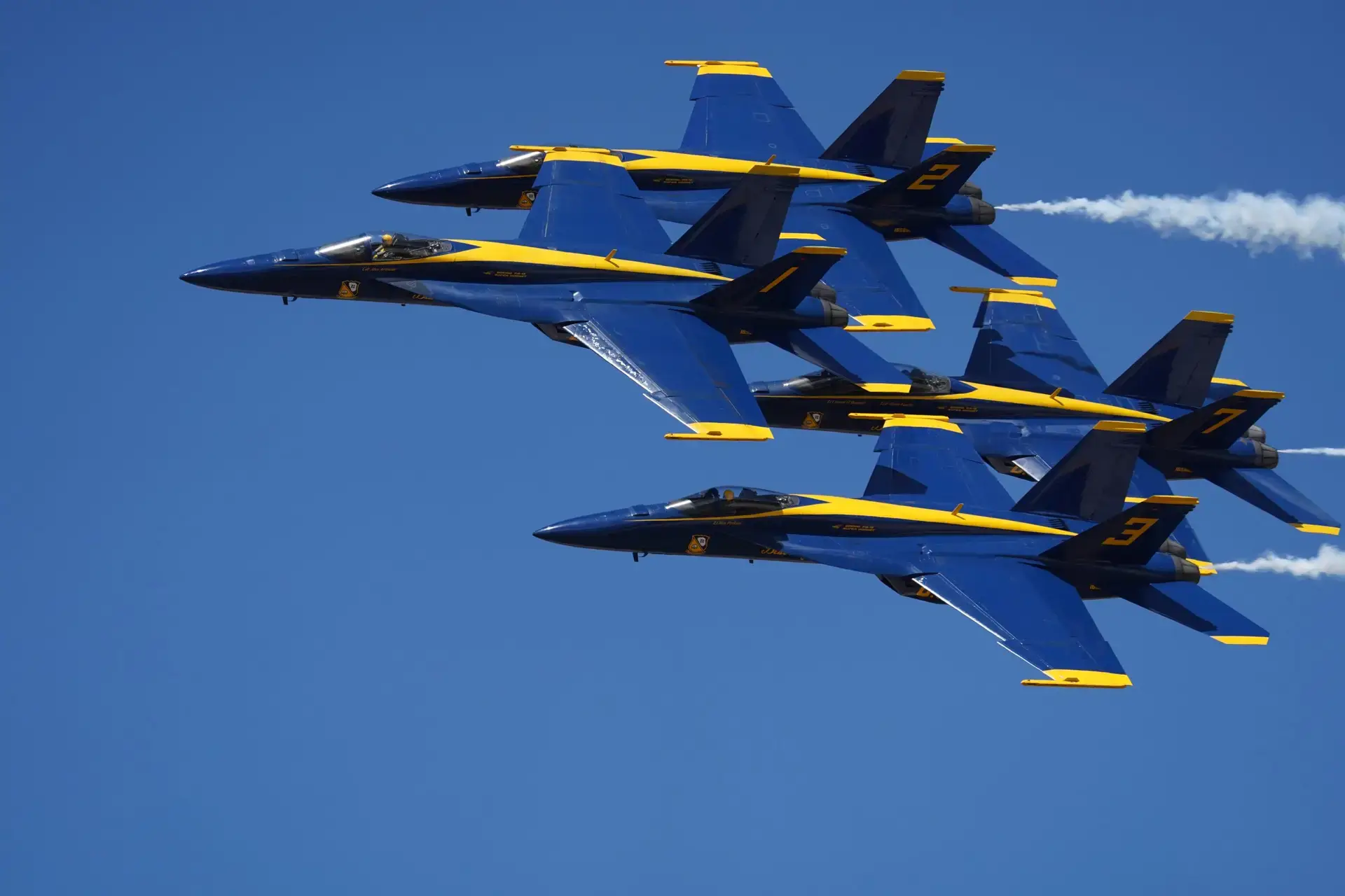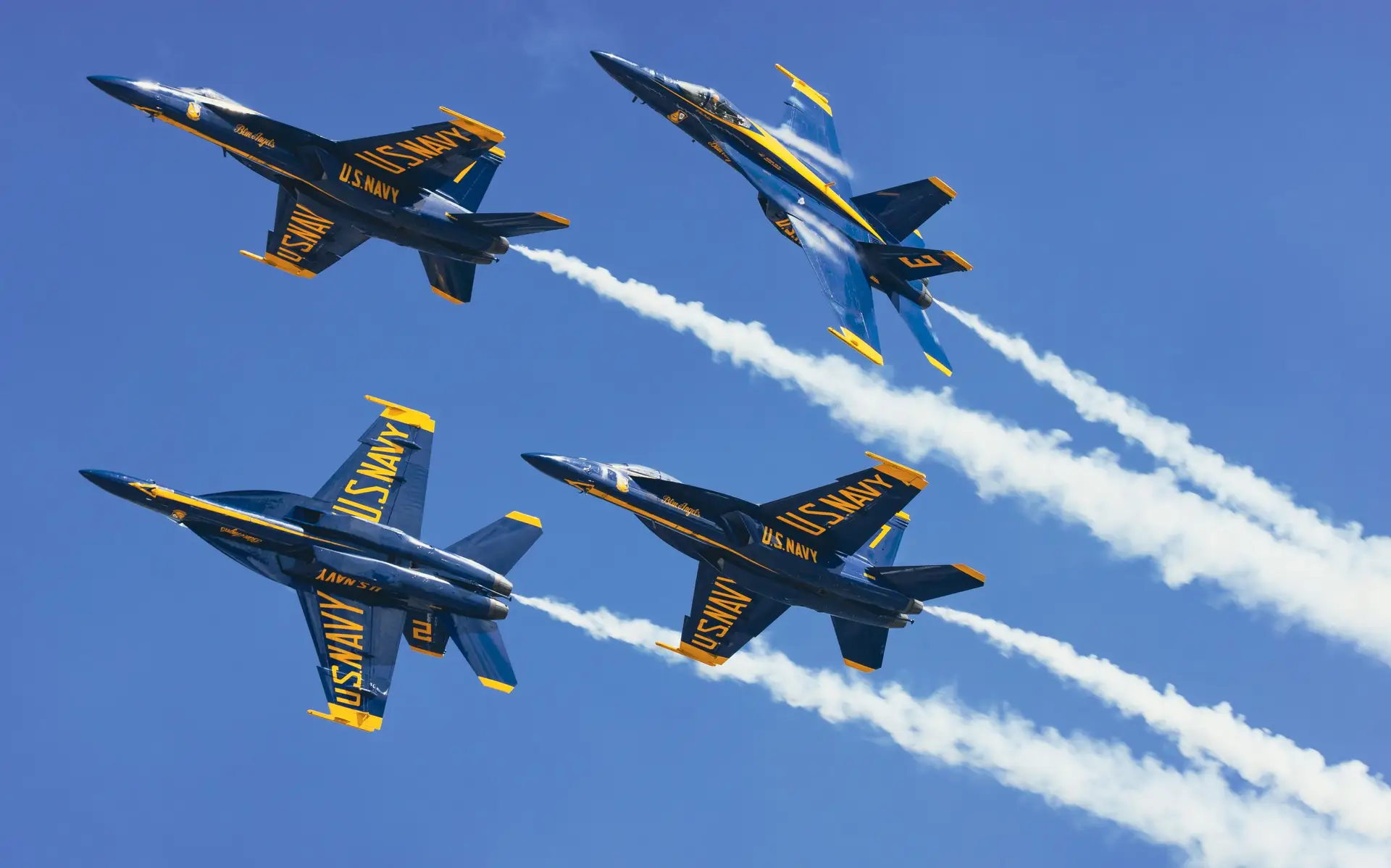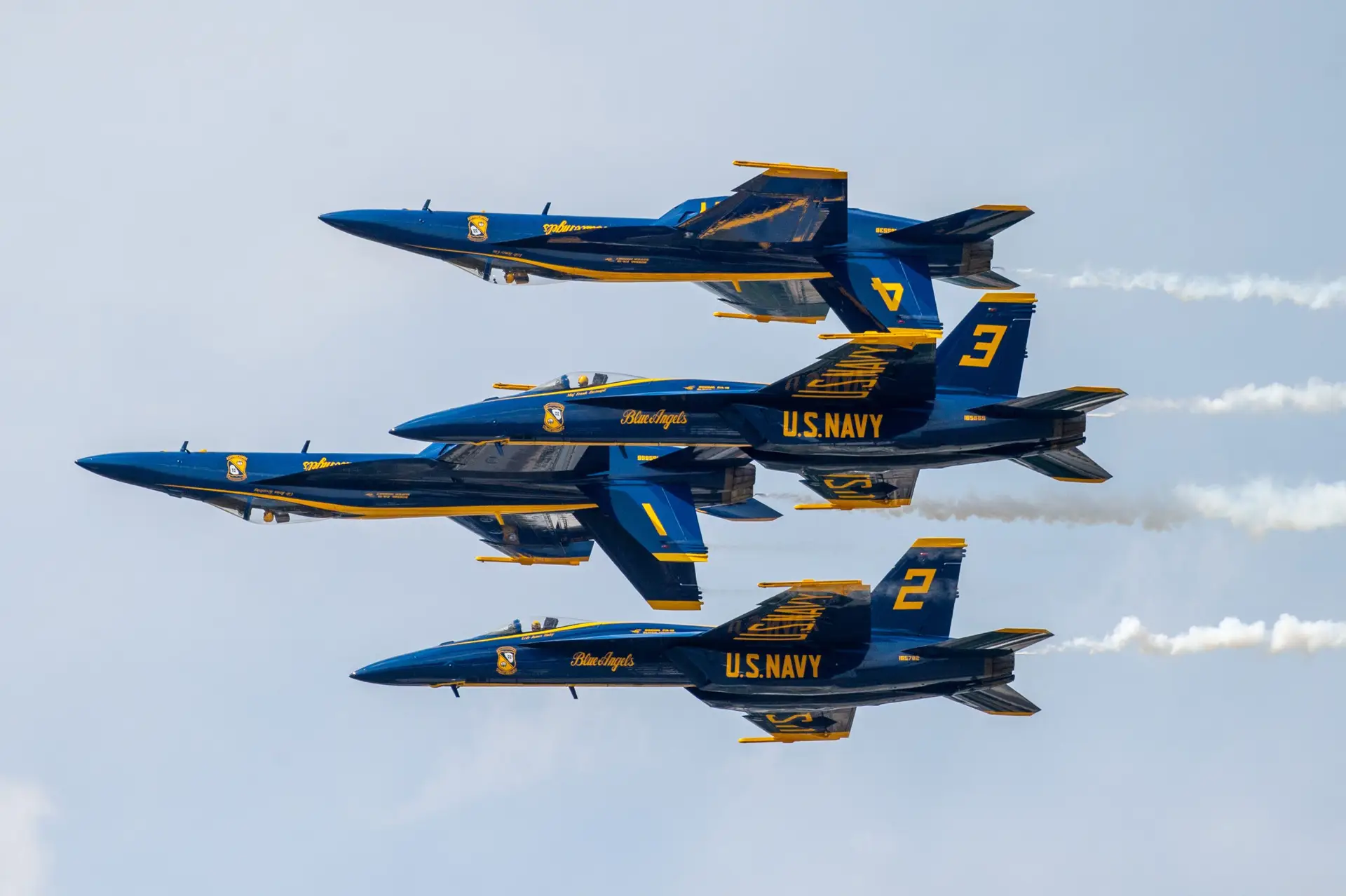 The Blue Angels is the United States Navy‘s flight demonstration squadron, with aviators from the Navy and Marines. Blue Angels six demonstration pilots currently fly the McDonnell Douglas F/A-18 E/F Super Hornet, typically in more than 70 shows at 34 locations throughout the United States each year. The Blue Angels also visit more than 50,000 people in a standard show season (March through November) in schools and hospitals. Since 1946, the Blue Angels have flown for more than 260 million spectators.