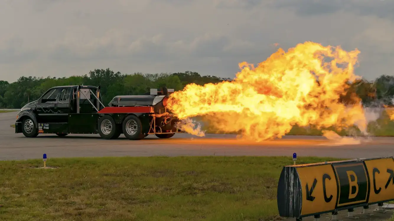 This Ford F-750 is 30 feet long, 8 feet wide and 7-1/2 feet high, with thrust coming from three GE J85 turbine engines with afterburners. That translates into 18,000 pounds of thrust, or 36,000 horsepower, in afterburner mode, and a quarter-mile time of just over six seconds.